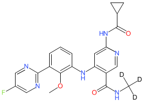 Comment: Deucravacitinib (BMS-986165) is a selective, orally active, allosteric inhibitor of the Janus kinase family enzyme, tyrosine kinase 2 (TYK2) [2,5]. The deuteromethyl amide group confers selectivity by virtue of binding to a pocket in the TYK2 JH2 pseudokinase domain.