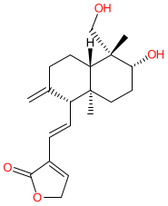 Comment: Andrographolide is a major component of the leaves of the traditionally used medicinal plant Andrographis paniculata (Acanthaceae) [6]. Andrographolide and analogues are being investigated for their potential anti-inflammatory activities [4], but andrographolide has also shown anti-viral, anti-thrombotic, hepatoprotective and anti-cancer properties [6]. Accumulated evidence indicates that the principal mechanism undelying andrographolide's anti-inflammatory action is inhibition of NF-κB. Additional studies show that Nrf2 activation by andrographolide likely enhances endogenous antioxidant defense mechanisms. Direct covalent interaction with Cys62, and non-covalent binding are both required for andrographolide-induced inhibition of NF-κB p50 [3].